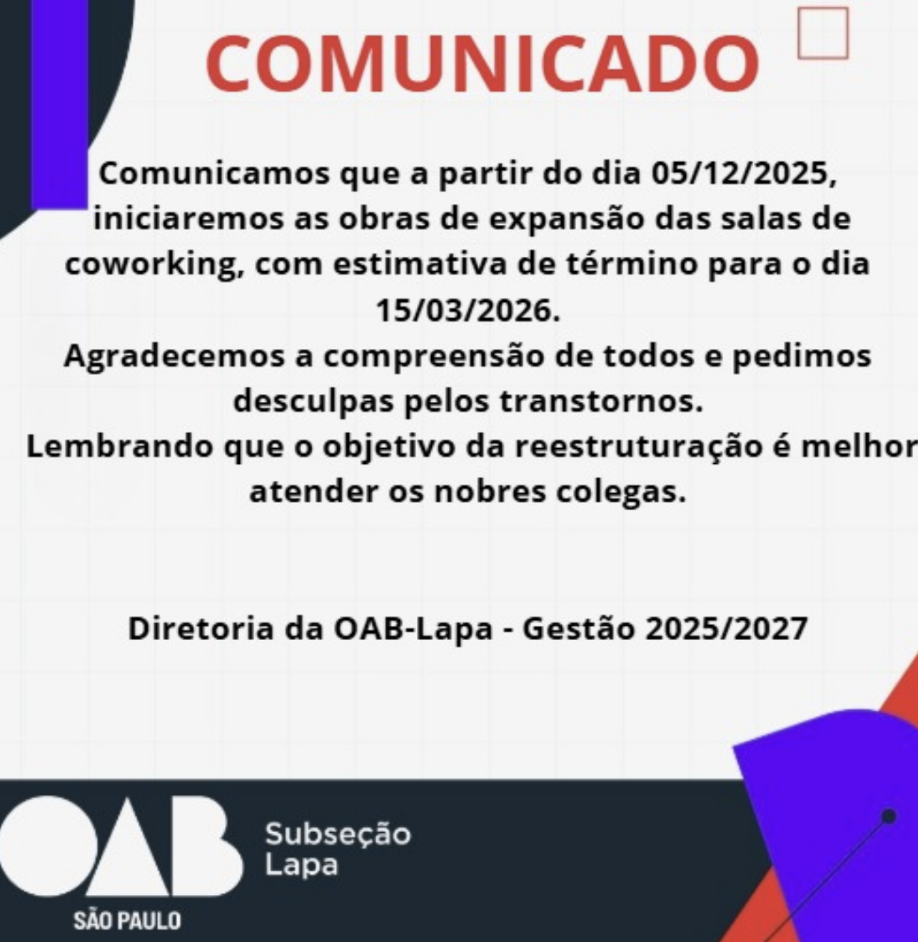 Comunicamos que a partir do dia 05/12/2025, iniciaremos as obras de expansão das salas de coworking, com estimativa de término para o dia 15/03/2026.